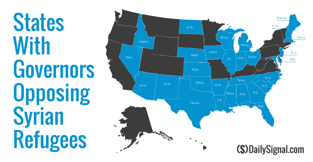 Thus far, states whose governors oppose more Syrian refugees include Alabama, Arizona, Arkansas, Florida, Georgia, Idaho, Illinois, Indiana, Iowa, Kansas, Louisiana, Maine, Massachusetts, Michigan, Mississippi, Maryland, Nebraska, New Hampshire, New Jersey, New Mexico, North Carolina, North Dakota, Nevada, Ohio, Oklahoma, South Carolina, Tennessee, Texas, and Wisconsin.