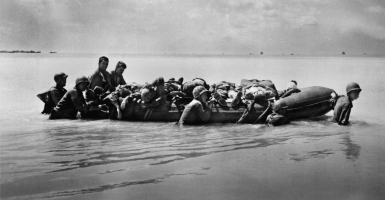 U.S. Marines take cover from Japanese fire behind a sea wall on Red Beach #3, Tarawa Island. Nov. 20, 1943. (Photo: Everett Collection/Newscom)