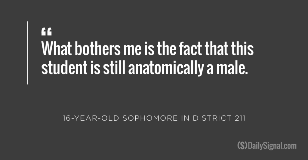 “What bothers me is the fact that this student is still anatomically a male,” a 16-year-old sophomore told The Daily Signal on the condition of anonymity. “If the student had already undergone surgical procedures, this would be another story entirely, but as it stands I just don’t feel comfortable with it.”