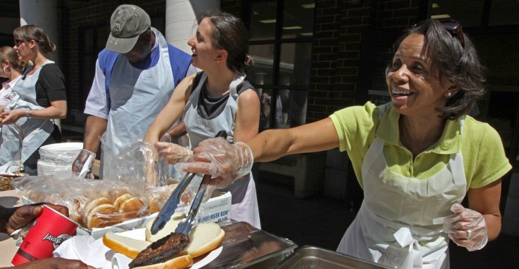 Wilhelmina Marie Wright, right, serves up hamburgers in May 2010 to hundreds of people at the Dorothy Day Center in St. Paul, Minn. (Photo by Bruce Bisping/Star Tribune/Newscom)