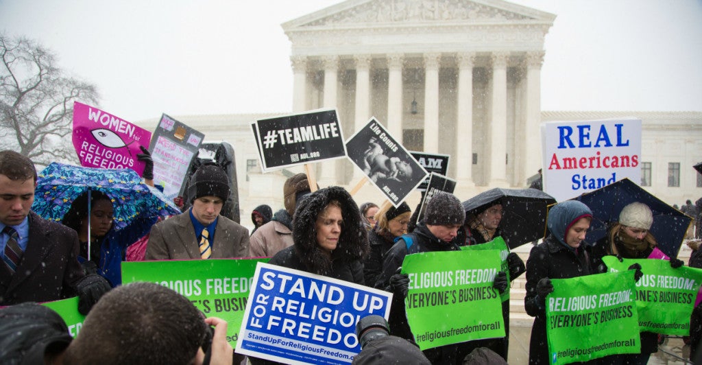 Hundreds rally for religious freedom outside the Supreme Court on March 25, 2014, during the Hobby Lobby case challenging Obamacare's mandates for religious employers. “It’s not about access, it’s about our beliefs and the sanctity of life,” Geneva College official Sue Thompson says in a new video. (Photo: Jeff Malet Photography/Newscom)