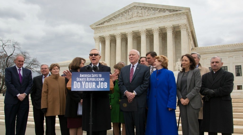 From the steps of the Supreme Court, Senate Democrats unleashed their latest messaging barrage in the battle over whether President Obama should fill the open seat of the late Justice Antonin Scalia.