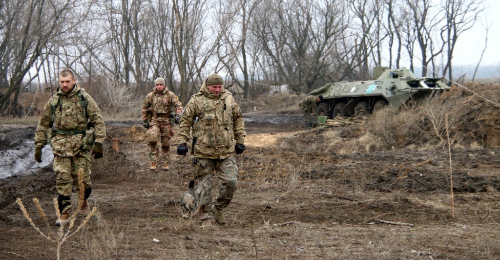 Ukrainian troops patrol no man’s land outside the town of Shchastya. (Photos: Nolan Peterson/The Daily Signal)