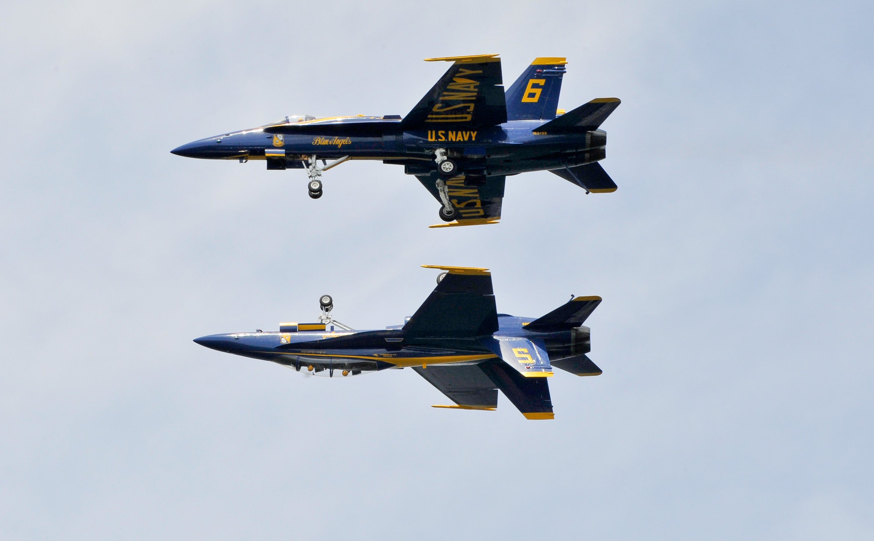 U.S. Navy Blue Angels, Lead Solo Lt. Ryan Chamberlain and Opposing Solo Capt. Jeff Kuss perform the Fortus maneuver at the United States Naval Academy Air Show on May 25. (Photo: U.S. Navy photo by Mass Communication Specialist 1st Class Andrea Perez/Released)