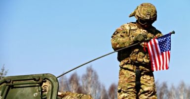 This woman with the American flags was among thousands of civilians who came out to welcome a U.S. Army Stryker convoy traveling across the Baltics. (Photo: Nolan Peterson/The Daily Signal)