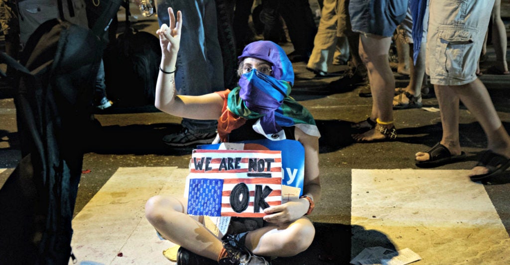 A protester flashes the peace sign to police officers across a barrier fence at the Democratic National Convention. (Photo: Christopher Occhicone/Zuma Press/Newscom)