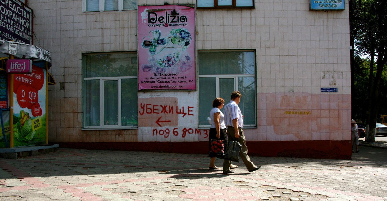 In September 2014, Kyiv residents were instructed to use the city’s subway system as a bomb shelter. Spray-painted signs pointing to the nearest bomb shelter became common sights on the sides of buildings throughout the capital city, as well as cities across the country.