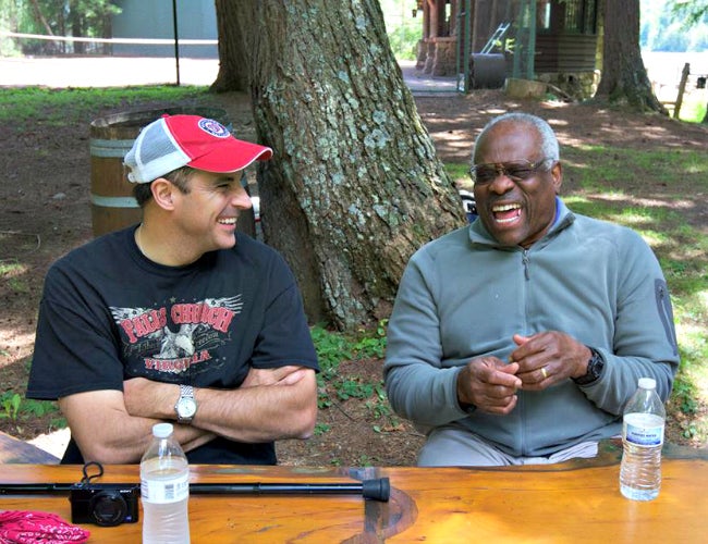 Justice Clarence Thomas enjoys a laugh with Mark Paoletta during an outing last year. (Photo: Mark Paoletta Facebook)