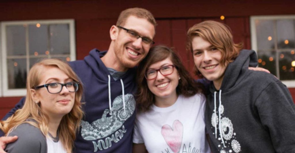 (Front row, left to right) Aidan, 20; Sophia, 16; Ian, 24; and Alyssa, 18; brainstorm and create the messaging and designs for LifeCulture items. (Photo: LifeCulture)