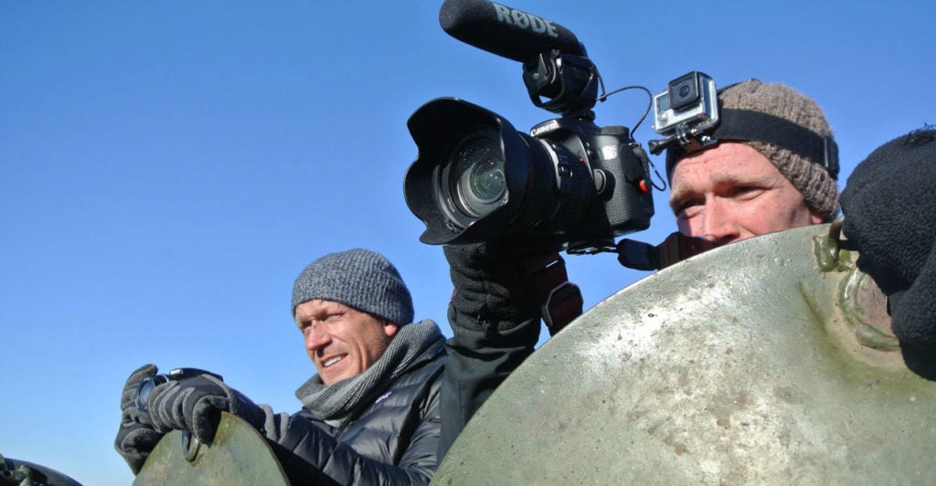 We agree with foolhardy enthusiasm. Shortly thereafter we’re standing in two open hatches on top of the armored vehicle as we cut across the edge of open fields, up and over berms, and down and across ditches.