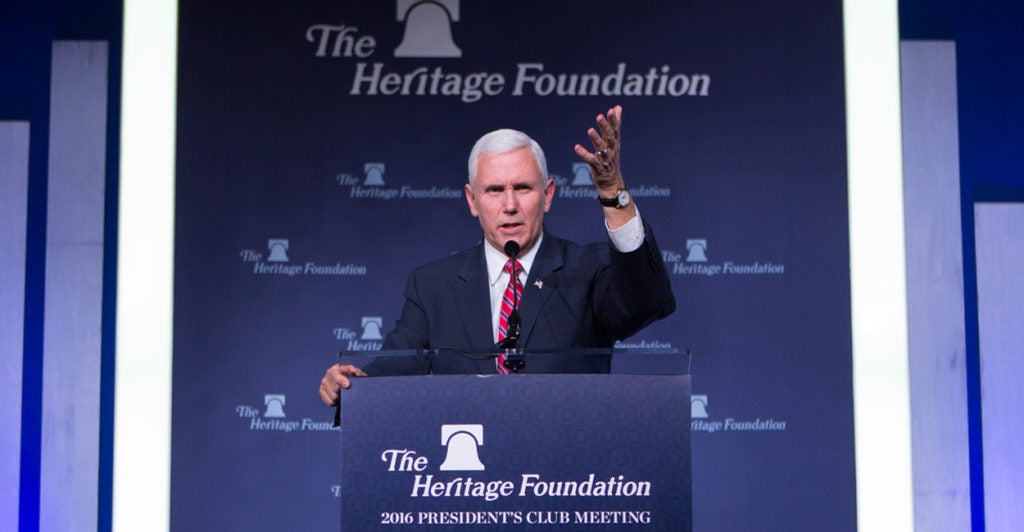 Pence expressed his gratitude to The Heritage Foundation for its help in the presidential transition, and said that the think tank’s former president, Ed Feulner, “has shown up each and every day at the transition office of the president of the United States.”