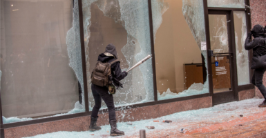 Hooligans smash the windows of a Bank of America branch as violence erupts during a march protesting Trump’s inauguration. (Photo: Josh Stafford/newzulu/Newscom)