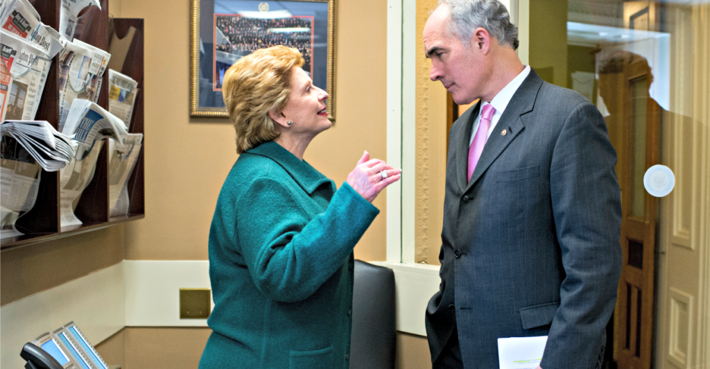 Sens. Debbie Stabenow, D-Mich., and Bob Casey Jr., D-Pa., here conferring before a press conference April 14, 2016, are among Senate Democrats up for re-election in 2018 in states won by Republican presidential nominee Donald Trump. (Photo: Bill Clark/CQ Roll Call/Newscom)