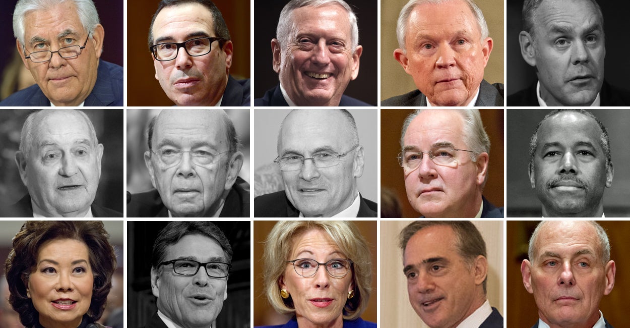 Photo: Trump's picks include (from top left) Rex Tillerson (Photo: Ron Sachs/ZUMA Press/Newscom); Steven Mnuchin (Photo: Ron Sachs/ZUMA Press/Newscom); James Mattis (Photo: Kevin Dietsch/UPI/Newscom); Jeff Sessions (Photo: Ron Sachs/ZUMA Press/Newscom); Ryan Zinke (Photo: Carlos Barria/Reuters/Newscom); Sonny Perdue (Photo: Albin Lohr-Jones/ZUMA Press/Newscom); Wilbur Ross (Photo: Mike Theiler/UPI/Newscom); Andrew Puzder (Photo: Ron Sachs/CNP/Newscom); Tom Price (Photo: Ron Sachs/DPA/Newscom); Ben Carson (Photo: Kevin Lamarque/Reuters/Newscom); Elaine Chao (Photo: Ron Sachs/ZUMA Press/Newscom); Rick Perry (Photo: Mark Reinstein/ZUMA Press/Newscom); Betsy DeVos (Photo: Ron Sachs/DPA/Newscom); David Shulkin (Photo: Veterans Health Administration/Flickr); and John Kelly (Photo: Ron Sachs/CNP/Newscom).