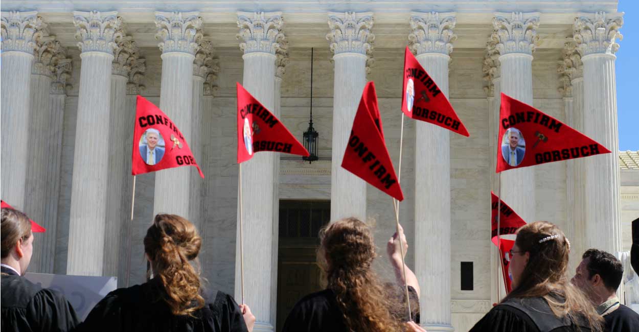 A group of pro-Gorsuch demonstrators also gathered at the Supreme Court and, while dressed in judge attire, sang a number of songs in support of the nominee.