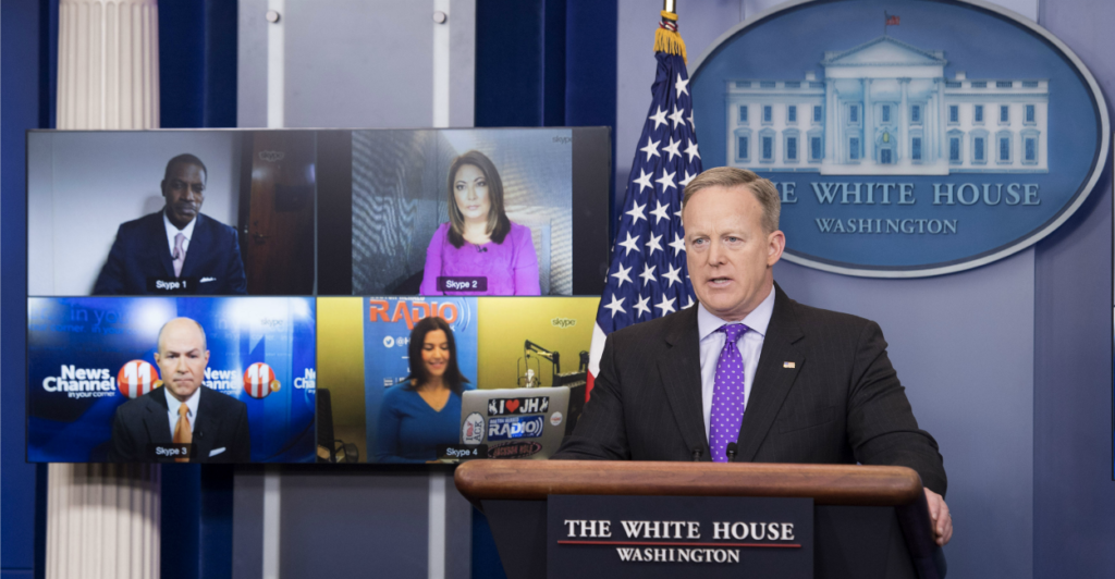 Journalists, commentators, and bloggers who don’t reside in Washington, D.C., now have the ability to ask White House press secretary Sean Spicer questions during his daily briefings via Skype, a video chat service that displays on the monitors behind Spicer’s lectern.