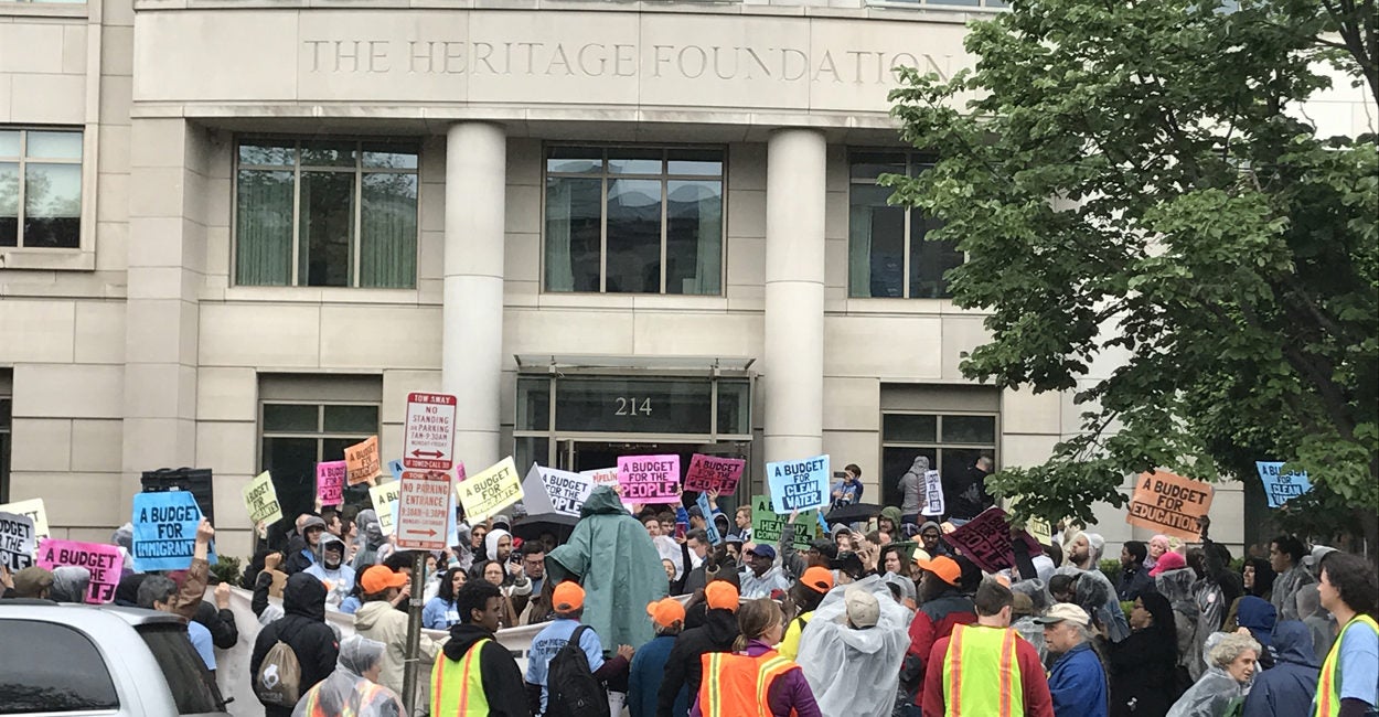 There, a number of speakers addressed the crowd of activists and criticized Heritage for the role it played in crafting Trump’s budget.
