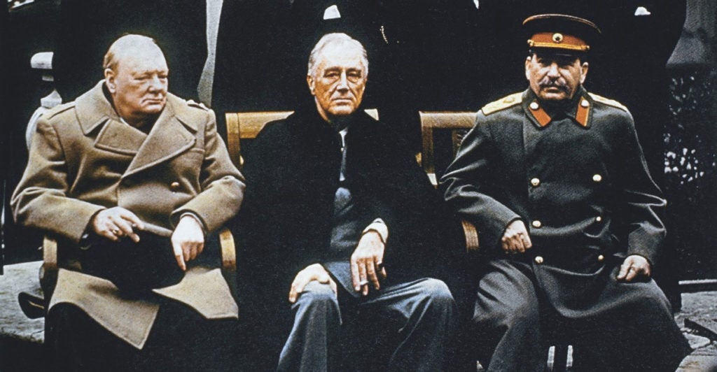 British Prime Minister Winston Churchill, U.S. President Franklin Delano Roosevelt, and Soviet Premier Josef Stalin (left to right) met in Yalta, Crimea, only months before the end of World War II. (Photo: Pictures From History/Newscom)