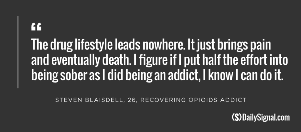 “From the time I was 13, doctors were pushing me pain pills as a safe alternative,” Blaisdell tells The Daily Signal four days after he relapsed on heroin over the Easter holiday, ending his latest attempt at sobriety. “I was prescribed pretty high amounts of them for a long time. I didn’t really have a lot of education growing up or warning about addiction until I was already addicted. So that’s kind of how it started for me.”