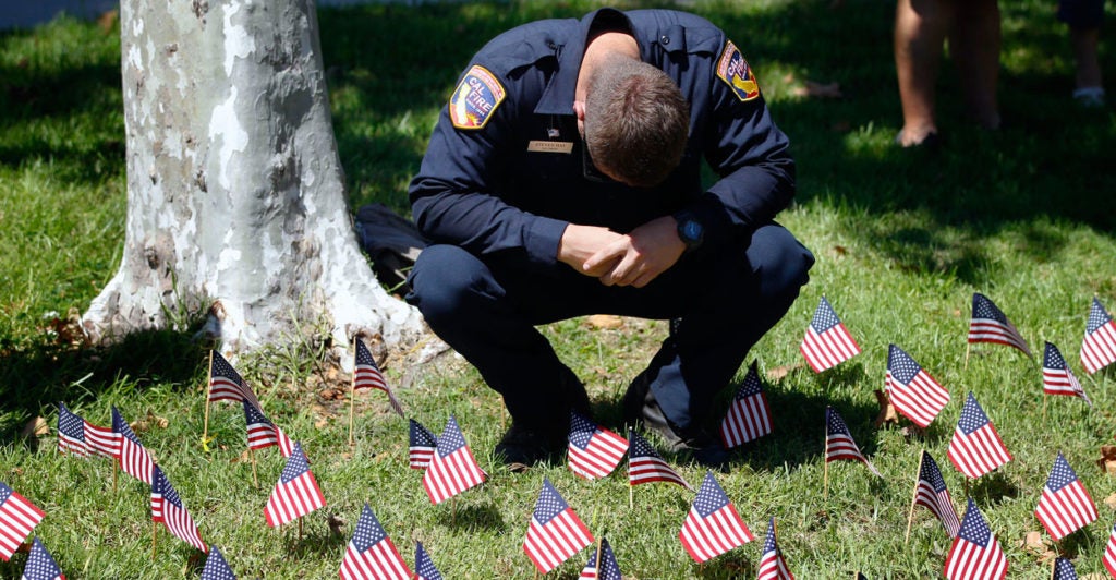 San Diego County firefighter Steven Hay prays Sept. 11 at Grossmont College for those lost in the 9/11 terror attacks. (Photo: Nelvin C. Cepeda/Zuma Press/Newscom)