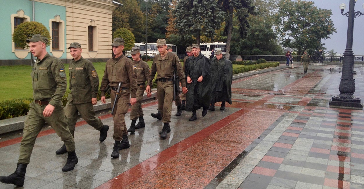 In front of the Verkhovna Rada, Ukraine’s parliament, riot police and National Guard troops poked their heads from out behind the plastic tarpaulins hanging over the back of their troop carrier trucks. The plaza in front of parliament and the grounds of nearby Mariyinksy Park had been filled with police and troops clad in riot gear for days.