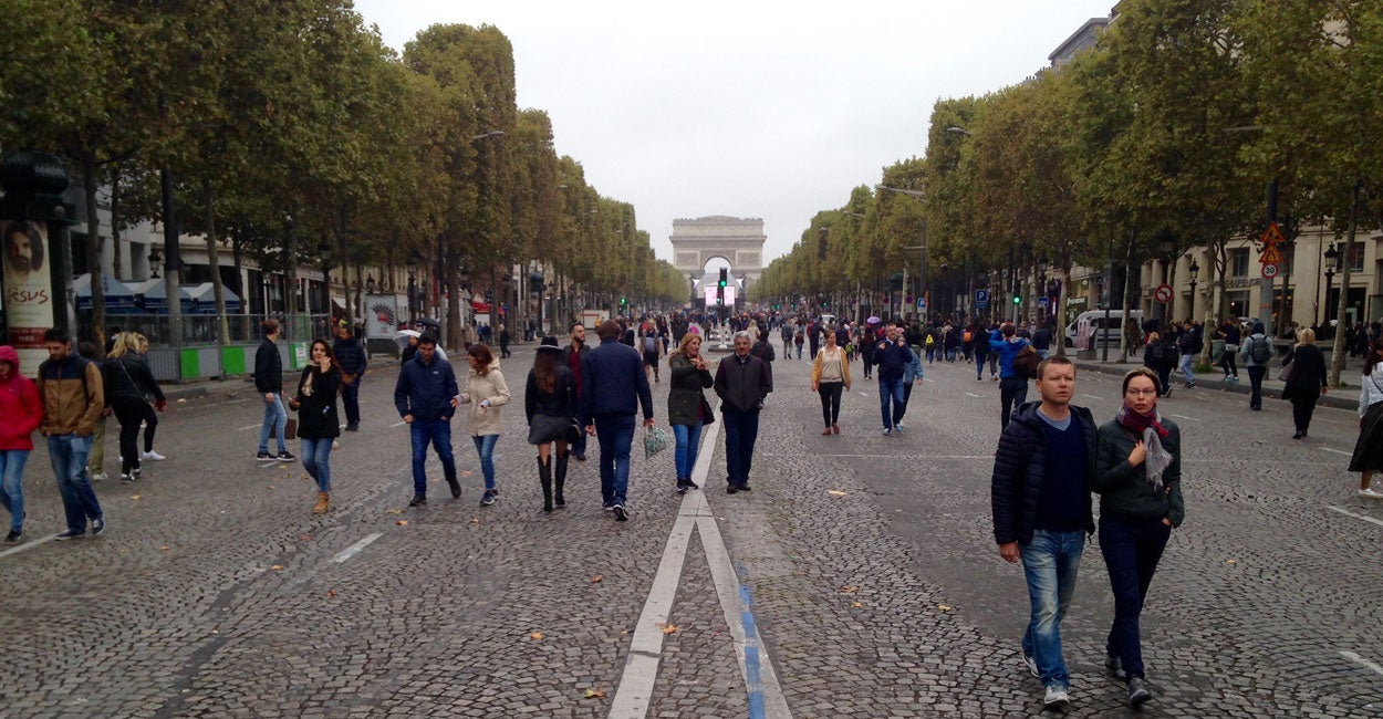 As part of the car-free day, the Avenue des Champs Élysées was sealed off to traffic. Metal barricades blocked both ends of the street where police officers searched the bags of pedestrians. Street performers played for the throngs of passers-by who strolled along the cobblestone way, which, when not used for motor traffic, is typically reserved for military parades, the Tour de France peloton, or conquering armies.