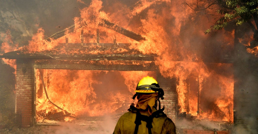 Ventura, California—Mariglo Esherick, 44, contemplates her loss as fire crews pour water on the smoldering embers that are all that remain of her home. Esherick, a single mother of four, stood in her sandals, wearing the only clothes she now owns: her down jacket, T-shirt, and sweat pants. (Photo: John Mccoy/ZUMA Press/Newscom)