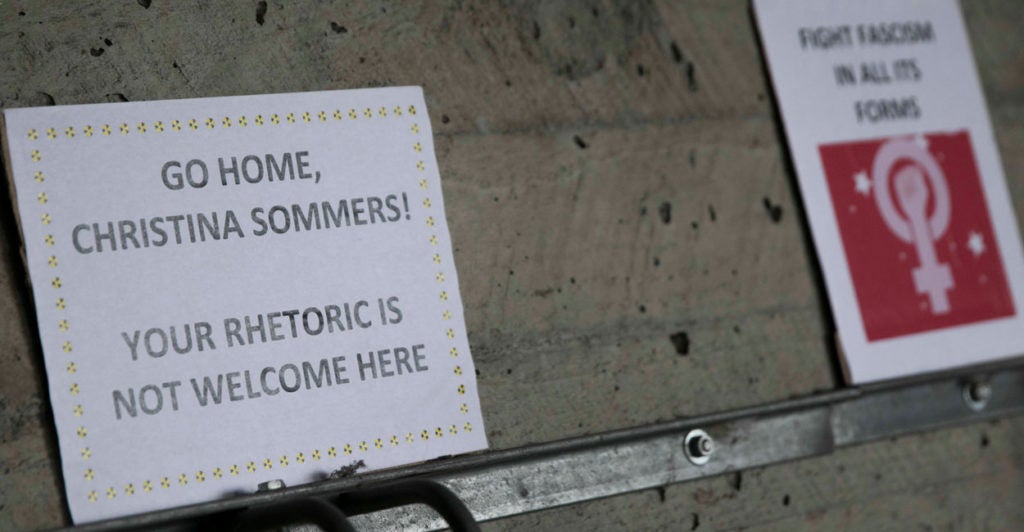 “Alright, are you all finished?” Sommers asked the protesters. “Because I think the rest of the audience would like to hear what I have to say. So can you be quiet for a while? And then we can debate and reason together. How about that?”