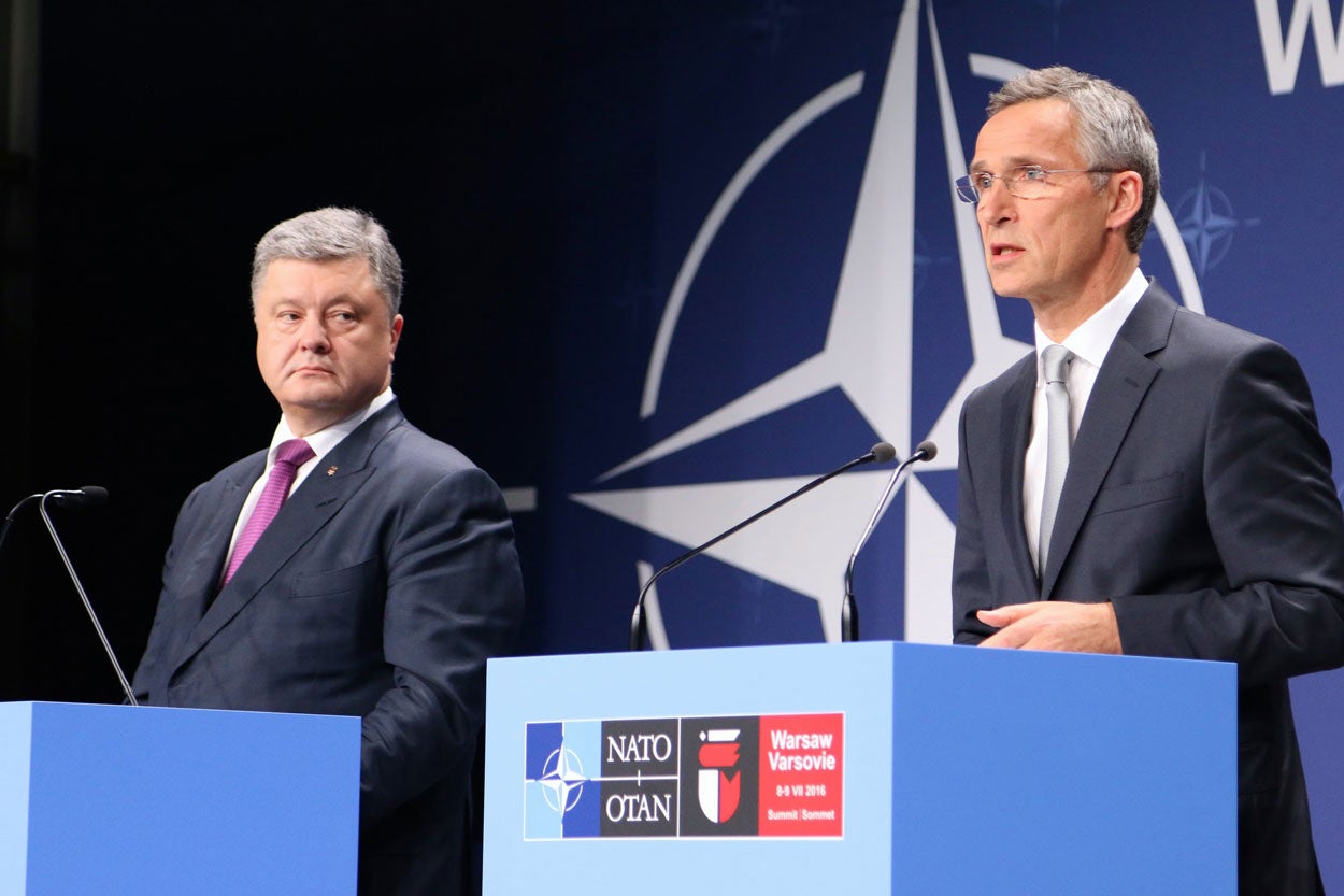 Ukrainian President Petro Poroshenko, left, beside NATO Secretary-General Jens Stoltenberg at the Western alliance’s 2016 summit in Warsaw. (Photos: Nolan Peterson/The Daily Signal)