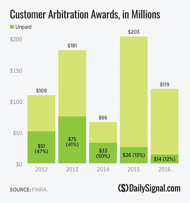 The amounts awarded vary year to year, but often exceed $100 million. The amounts that broker-dealers do not pay have been as high as 50 percent in some years, but can be as low as 12 percent. Usually, but not always, non-payment is because the broker-dealer or registered representative is insolvent.