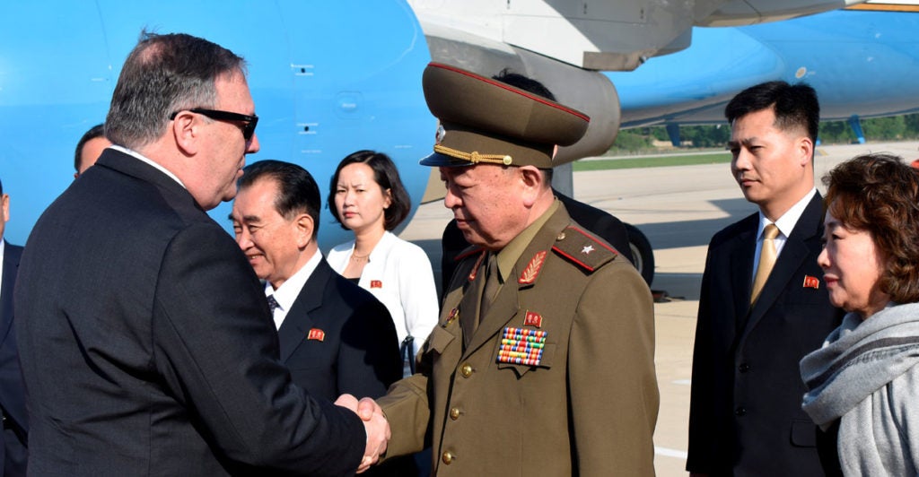 U.S. Secretary of State Mike Pompeo greets an unidentified North Korean general on arrival at the Pyongyang, North Korea, on May 9. (Photo: Pool/Reuters/Newscom)