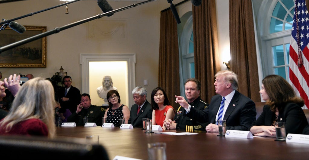 Seven mayors, four sheriffs and one deputy sheriff, two county supervisors, a city council member, and a district attorney—all from California—attended the White House meeting with the president and administration officials from the Justice and Homeland Security departments. Each expressed support for the administration’s tough immigration policies.