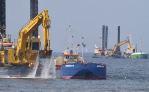 Excavators work on a discharge channel of the new Nord Stream 2 Baltic Sea pipeline in the Bay of Greifswald, May 15, 2018. (Photo: Stefan Sauer/dpa/picture-alliance/Newscom)