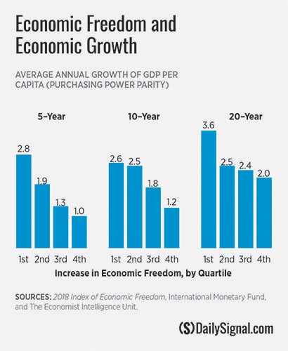 In fact, Heritage’s Index shows that on average, countries with the greatest increase in economic-freedom scores over 5-, 10-, and 20-year periods also have the greatest average annual growth in gross domestic product (GDP) per capita.