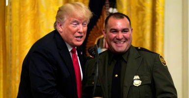 More than 150 officers and agents of two federal agencies, Immigration and Customs Enforcement and Customs and Border Protection, attended the event in the East Room of the White House.