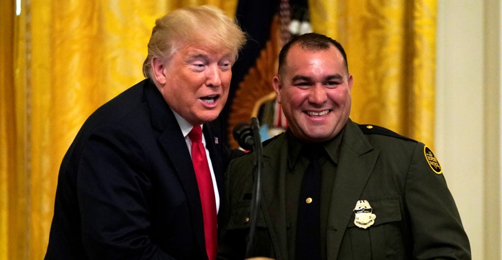 More than 150 officers and agents of two federal agencies, Immigration and Customs Enforcement and Customs and Border Protection, attended the event in the East Room of the White House.