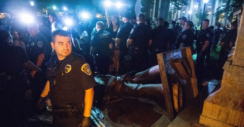“Around 9:20 p.m. Monday night, a group from among an estimated crowd of 250 protesters brought down the Confederate Monument on the campus of the University of North Carolina at Chapel Hill,” UNC Chapel Hill said in an official statement in an email to The Daily Signal.