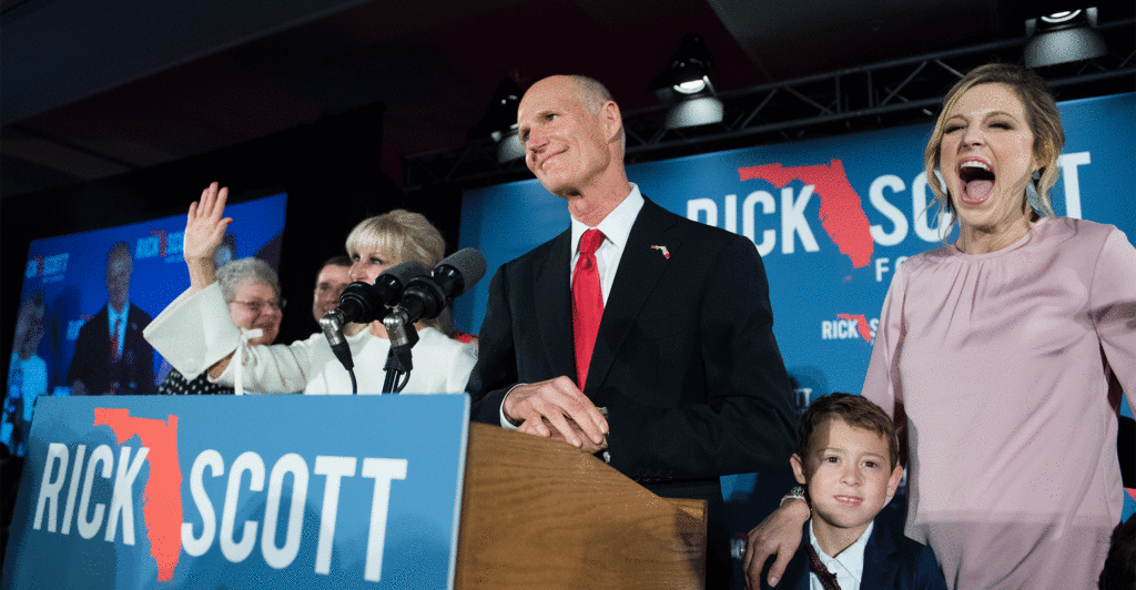 Florida Gov. Rick Scott, picturing delivering his victory speech Tuesday night, defeated incumbent Democrat Bill Nelson in the state's Senate race. He is expected to be one of seven Republicans and one Democrat who will join the Senate in January, after a mandatory recount. (Photo: Tom Williams/CQ Roll Call/Newscom)