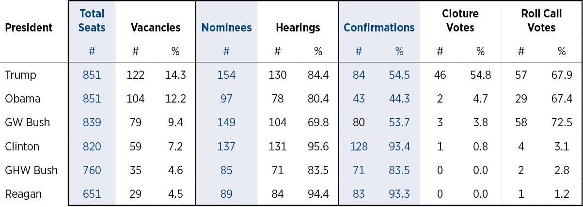 Each of these categories can significantly affect what people know or understand about the process. For example, Trump’s 19 appointments in 2017 and President Bill Clinton’s 20 appointments in 1996 appear comparable until one realizes that vacancies averaged 127 in 2017, but only 61 in 1996.