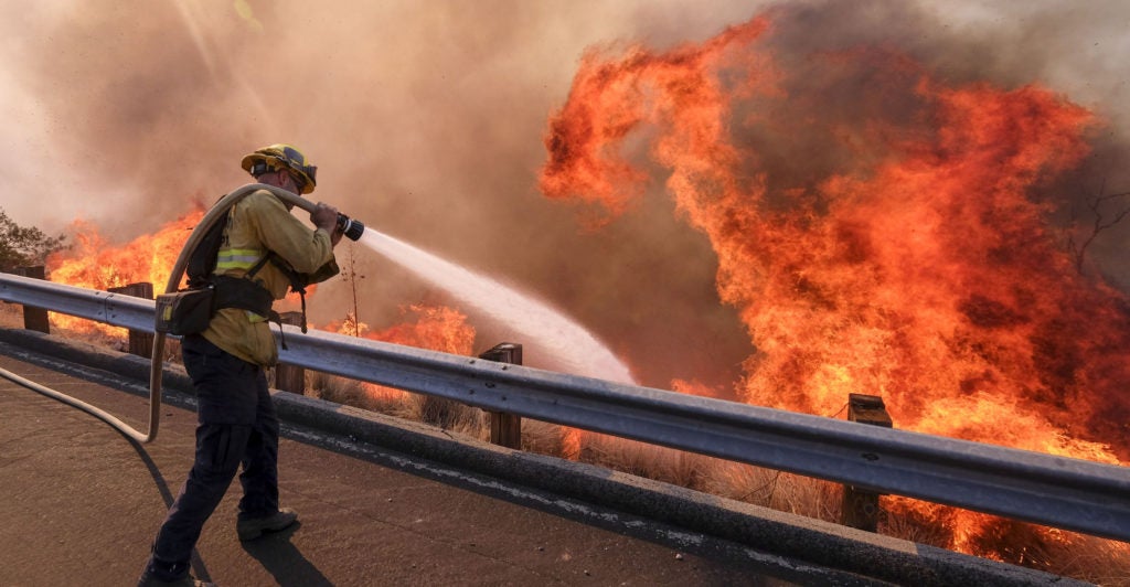Firefighters battle the Woolsey Fire in Malibu, California, Nov. 9, 2018. The fire destroyed dozens of structures, forced thousands of evacuations, and closed a major freeway. (Photo: Eric Thayer/Reuters/Newscom)