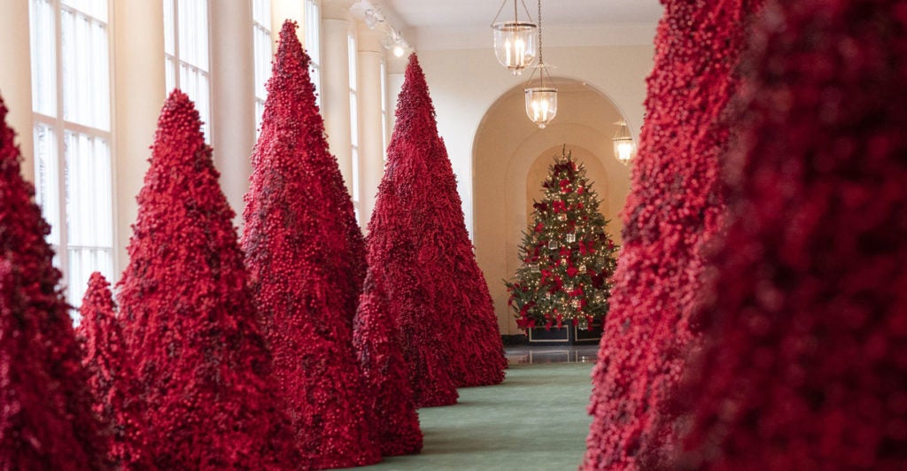 “American Treasures” is the theme of the White House’s 2018 Christmas decorations. Crafted by first lady Melania Trump, the decorations stunned once again, with nearly 30 Christmas trees and over 14,000 red ornaments.
