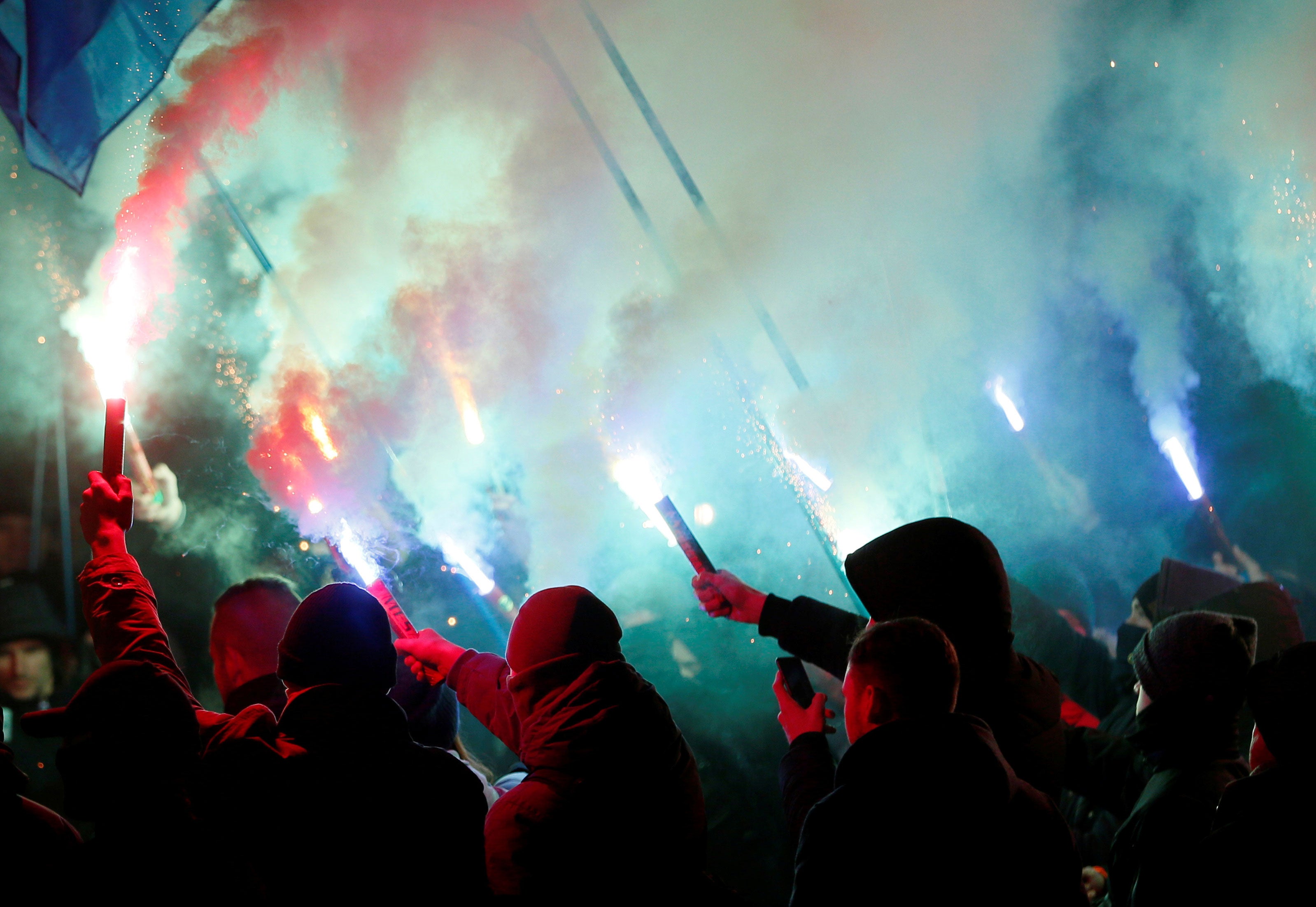 Activists of opposition parties burn flares during a rally demanding to break an agreement with Russia on the use of the Sea of Azov and the Kerch Strait in front of the parliament building in Kyiv, Ukraine, Nov. 26, 2018. (Photo: Gleb Garanich/Reuters/Newscom)