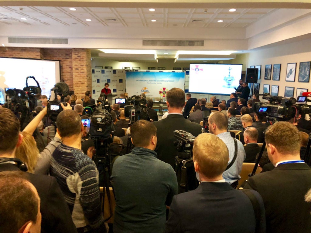 The conference room was standing room only, packed with journalists as well as uniformed navy officers from Ukraine and NATO countries. A solid row of television cameras lined the back galley.
