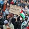Anti-Israel protesters hold signs reading "Israel is Starving Kids to Death" and "Israel Shoots Kids in the Head" during rally.