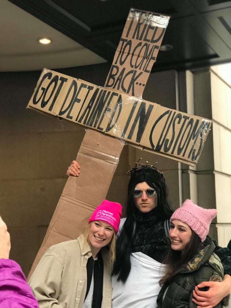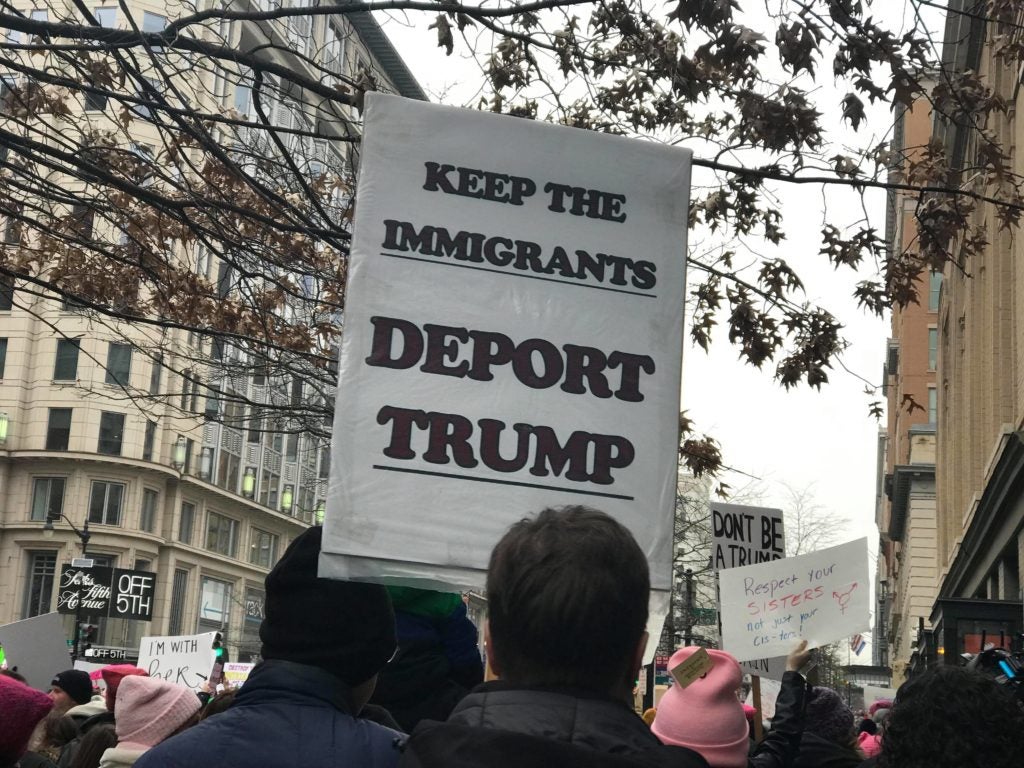 Many marchers held signs protesting the barrier Trump wants to erect along the U.S.-Mexico border to improve homeland security and stop illegal border crossings.