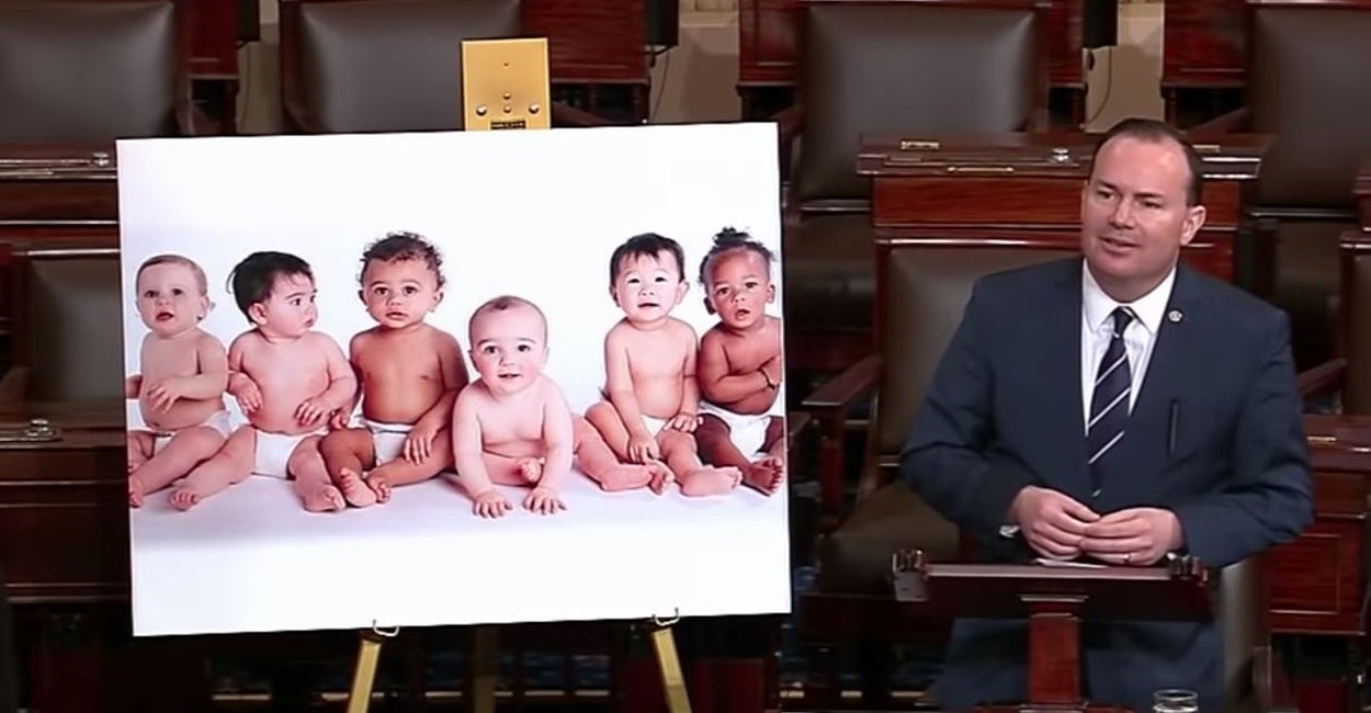 No, the most controversial poster of the 14-minute speech turned out to be a simple image of six smiling babies.