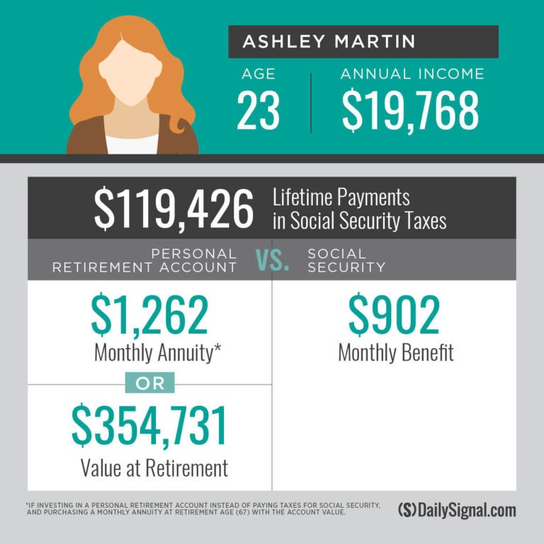 If Ashley, a 23-year-old with just under $20,000 in annual earnings, had the opportunity to invest her payroll taxes on her own, she would accumulate a $355,000 retirement. That account would be enough to purchase an annuity that would provide her with $1,260 per month, or 40% more than the $900 Social Security will provide.