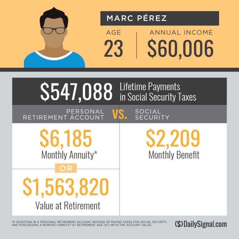 Our analysis showed that if Marc, a 23-year-old with $60,000 in annual earnings, were to invest his Social Security taxes on his own, he would accumulate a retirement account worth $1.56 million.