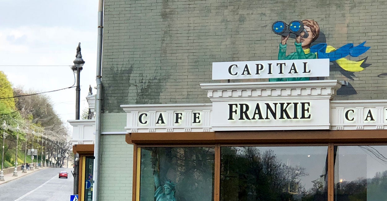 Nearby, a building that overlooks the intersection bears the mural of a girl peering through binoculars. Representing Ukraine’s national colors, the blue and yellow scarf around the girl’s neck is blown backward by the wind in her face. The binoculars’ glass reflects an image of what the girl is looking at from a distance—it is the EU’s flag.