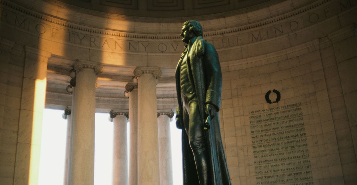 Yeah, he was flawed. Yeah, he made a lot of mistakes, and he didn’t free his own slaves, even after he died. George Washington at least made arrangements for his slaves to be freed after he and Martha had passed, and they [were]. Jefferson didn’t do that, and I consider that tragic. But he nonetheless deserves some credit for acknowledging, way ahead of his time, that this was immoral, that it was barbaric.